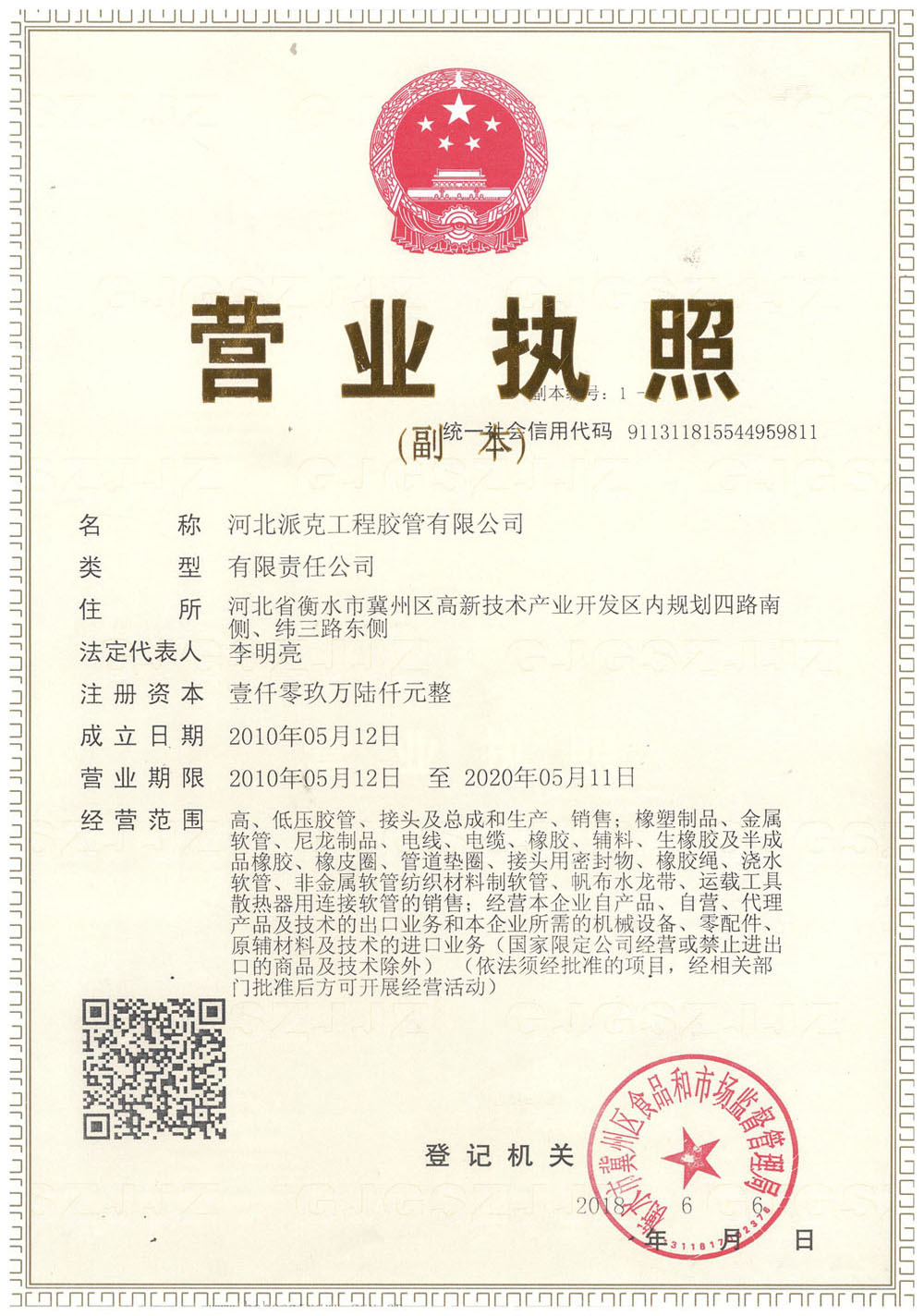 河北派克工程膠管有限公司是液壓膠管、高壓膠管、鋼絲編織蒸汽膠管、耐磨噴砂膠管、高壓膠管總成等特種軟管的專業生產企業,企業占地13萬6千平方米,主要生產高壓膠管、液壓膠管、鋼絲編織蒸汽膠管、膠管總成、及各種SAE標準液壓膠管、DIN標準液壓膠管、鋼絲纏繞液壓膠管、鋼絲編織液壓膠管、耐火阻燃膠管、纖維增強高壓膠管、高壓鉆探膠管、高壓海洋膠管等特種橡塑制品,現有職工856人,其中技術人員58人,固定資產8800萬元,流動資金6200萬元,是同膠管行業中規模較大的生產企業。